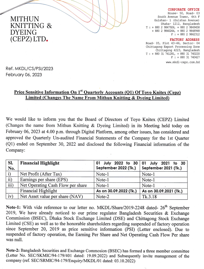 Price Sensitive Information (Q1) of Mithun Knitting And Dyeing ( CEPZ ) Ltd.