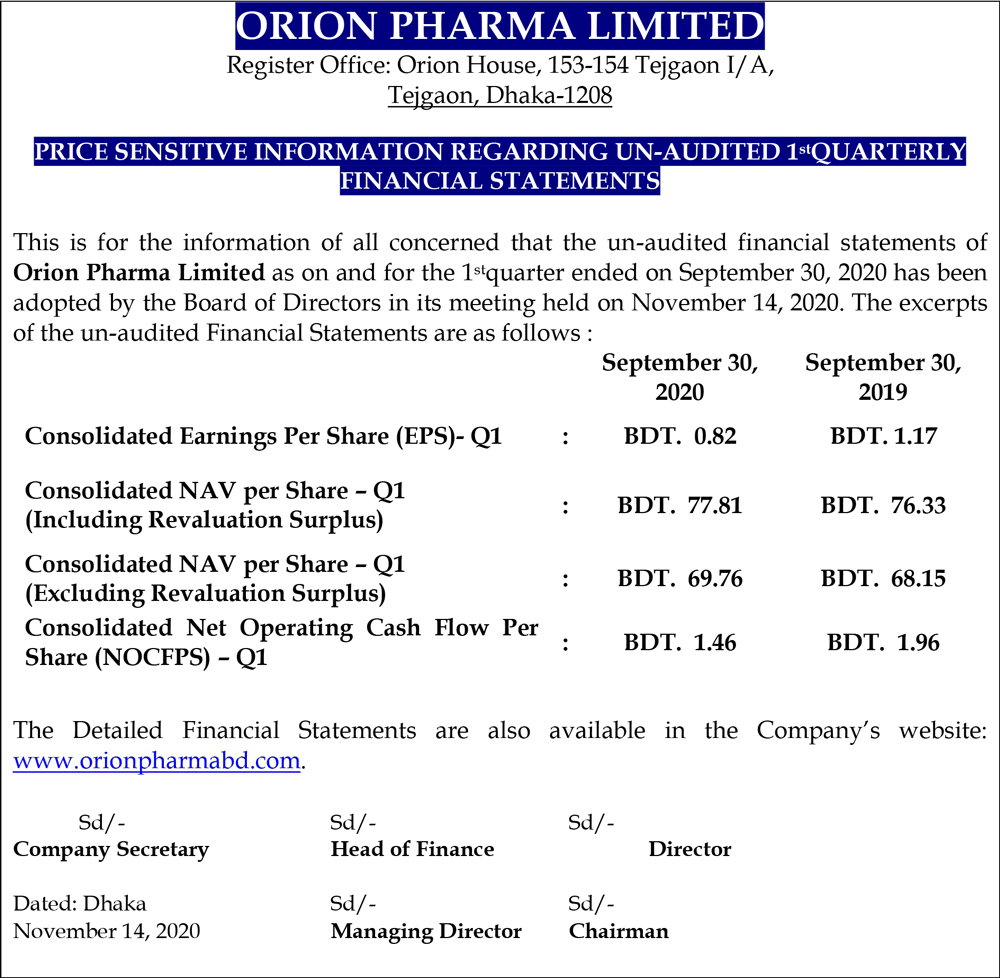 Un-audited Q3 Financial Statements of Orion Pharma Ltd.