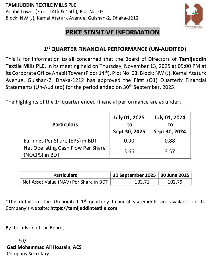 Price Sensitive Information (Q1) of Tamijuddin Textile Mills PLC.