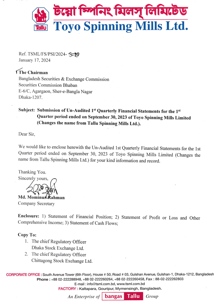 Q1 Financial Statements of Toyo Spinning Mils Ltd. (Tallu)