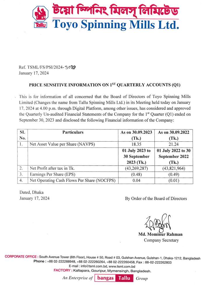 Price Sensitive Information (Q1) of Toyo Spinning Mils Ltd.