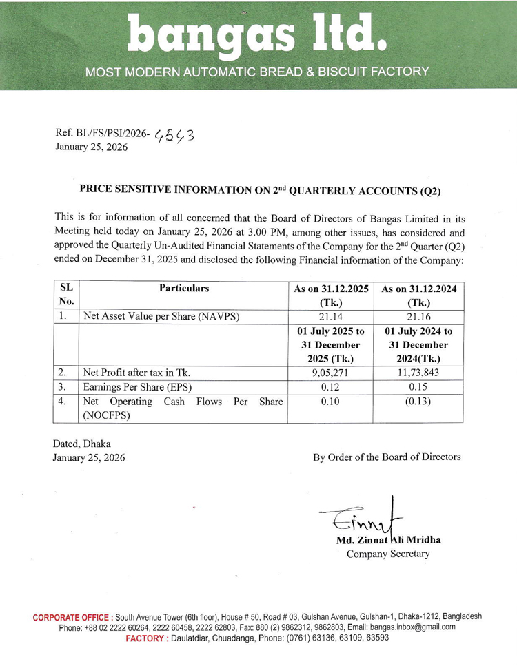 Price Sensitive Information (Q2) of Bangas Limited