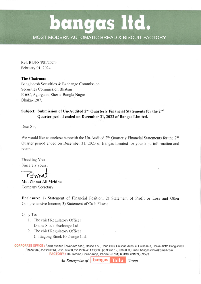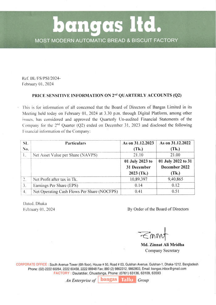 Price Sensitive Information (Q2) of Bangas Ltd.