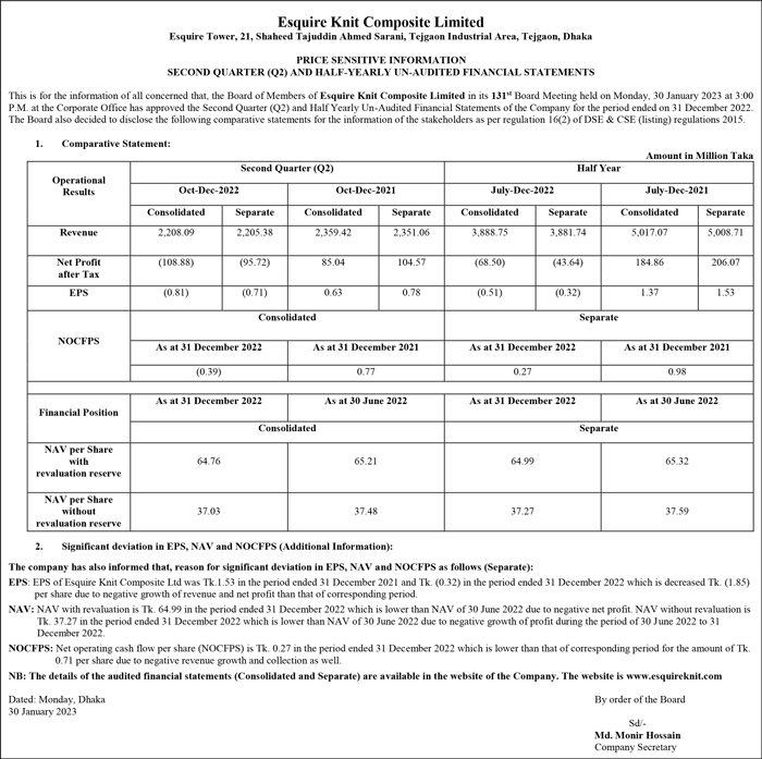 Price Sensitive Information of Esquire Knit Composite Ltd.