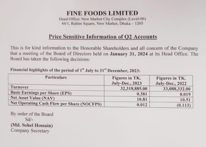 Price Sensitive Information (Q2) of Fine Foods Limited