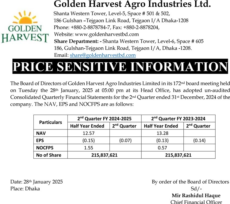 Price Sensitive Infomation of Golden Harvest Agro Industries Ltd