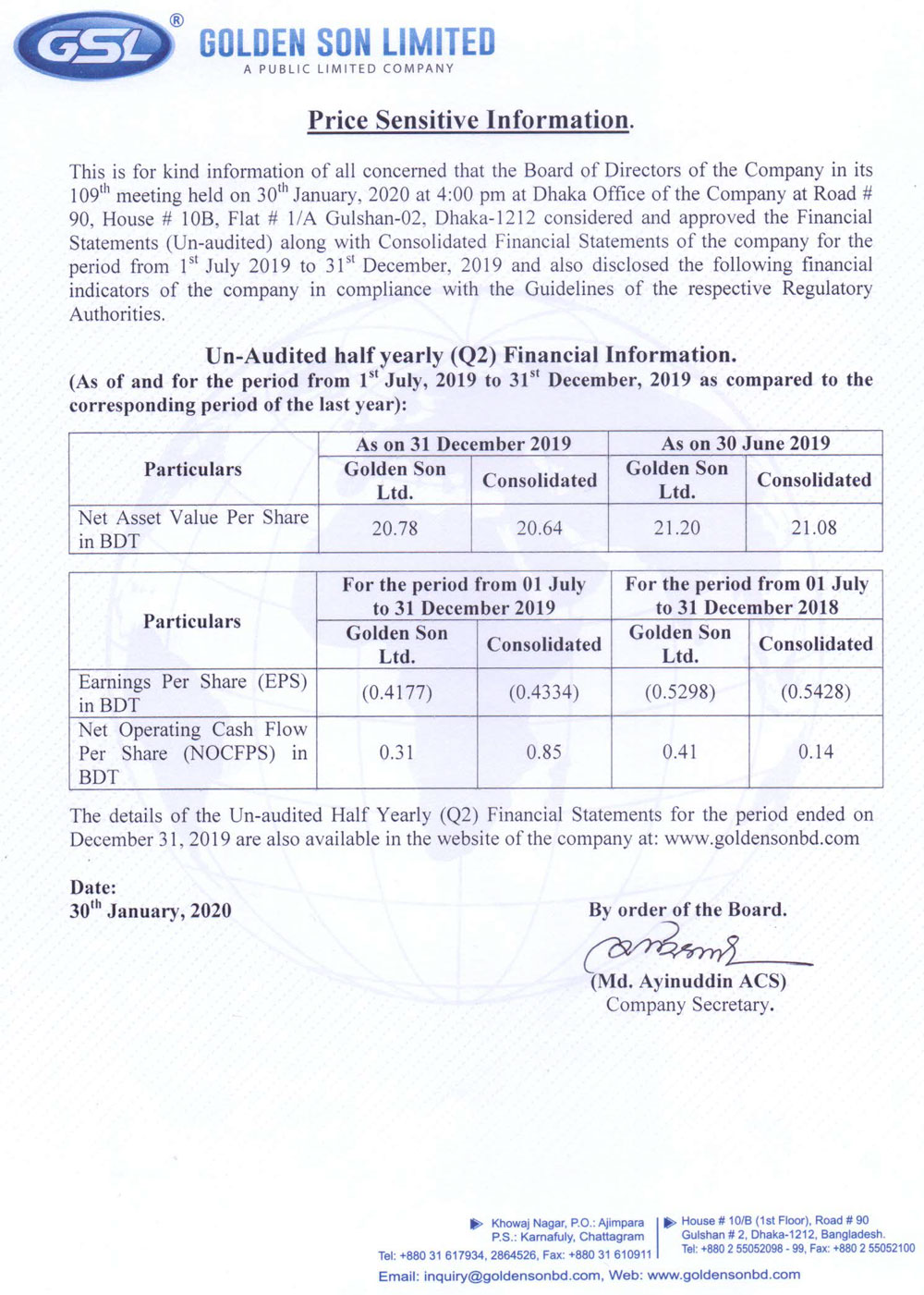 Price Sensitive Information (Q2) of Golden Son Ltd