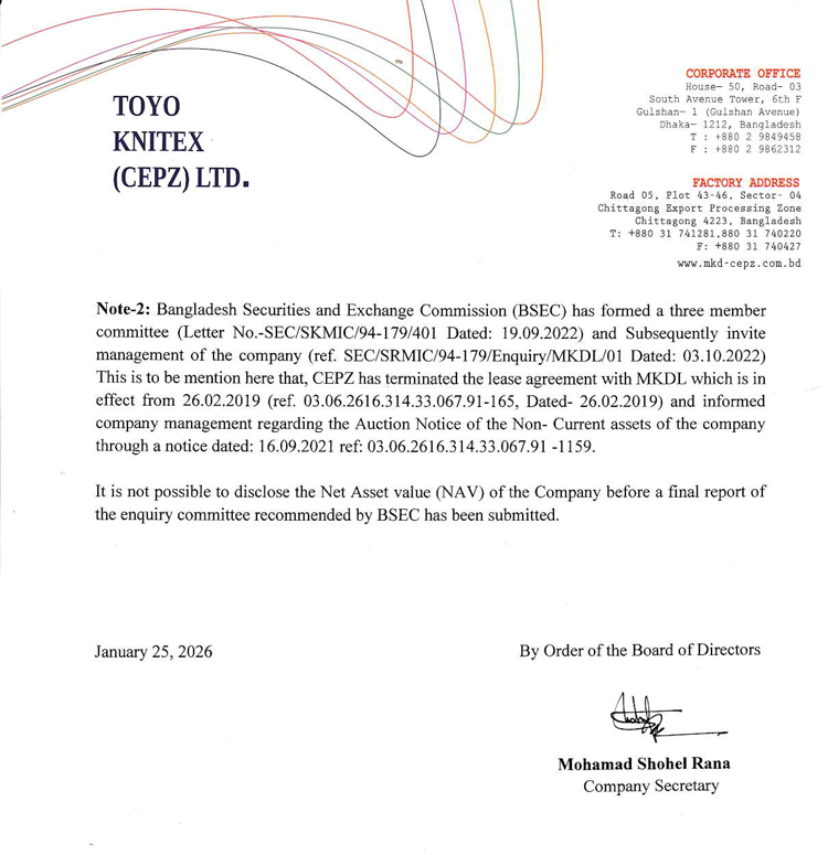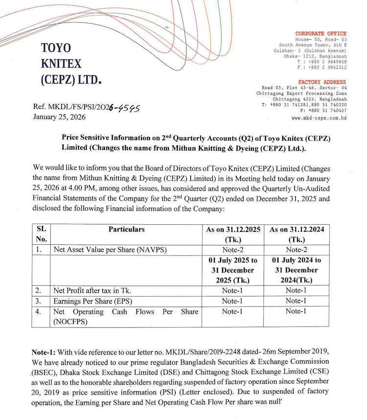 Price Sensitive Information (Q2) of Toyo Kintex (CEPZ) Ltd.