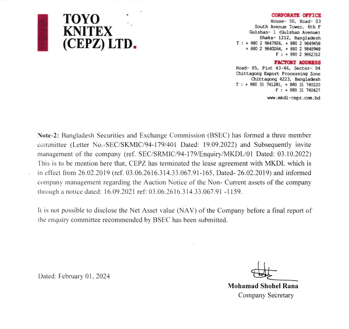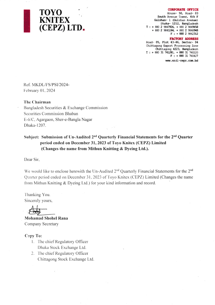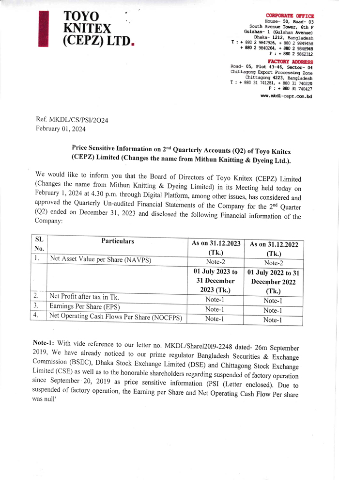 Price Sensitive Information (Q2) of Toyo Kintex (CEPZ) Ltd.
