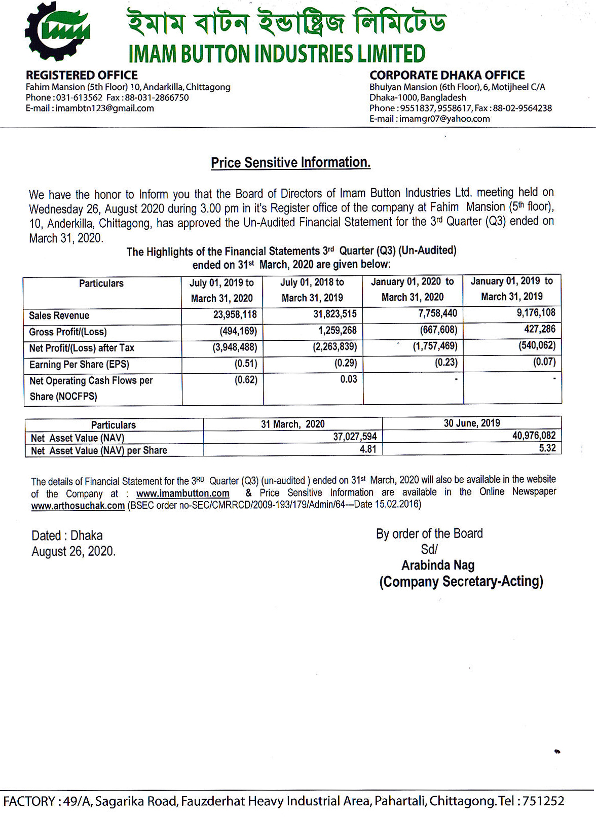 Price Sensitive Information (Q3) of Imam Button Industries Ltd