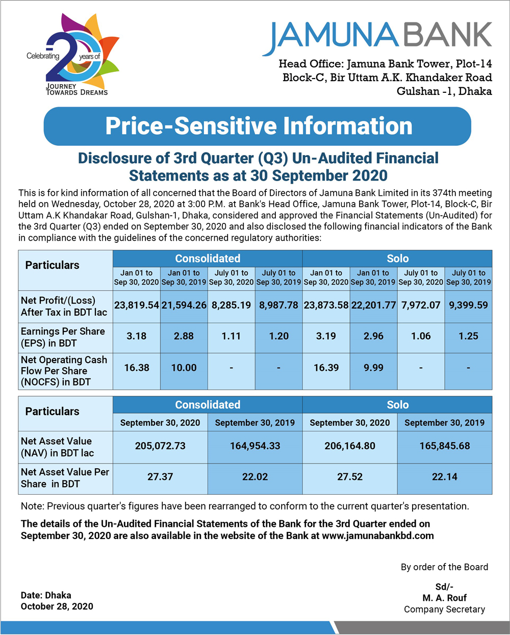 Price Sensitive Information (Q3) of Jamuna Bank Limited