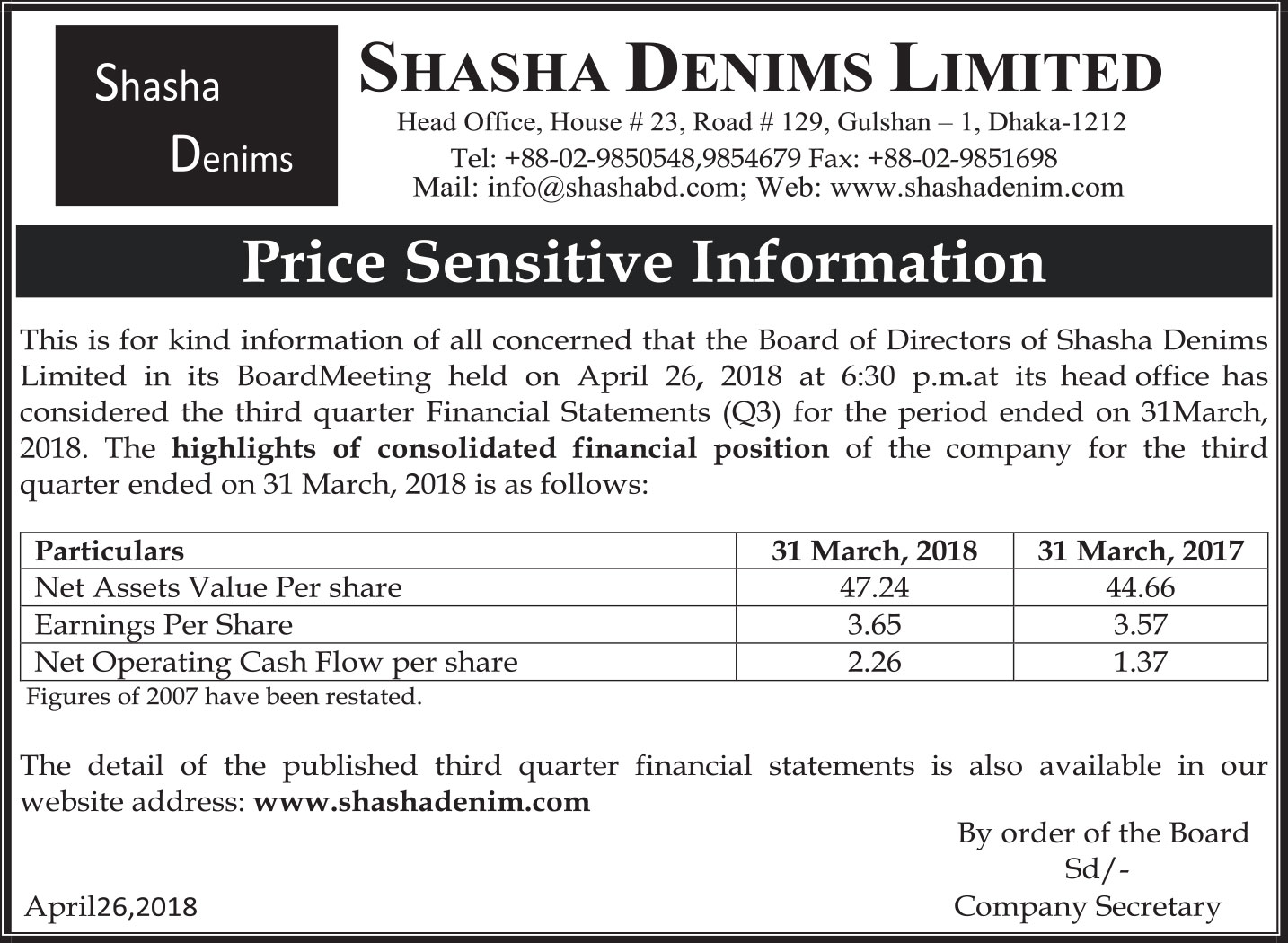 Price Sensitive Information (Q3) of Shasha Denims Limited