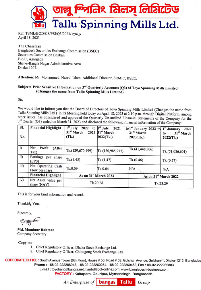 Price Sensitive Information (Q3) of Tallu Spinning Mills Limited
