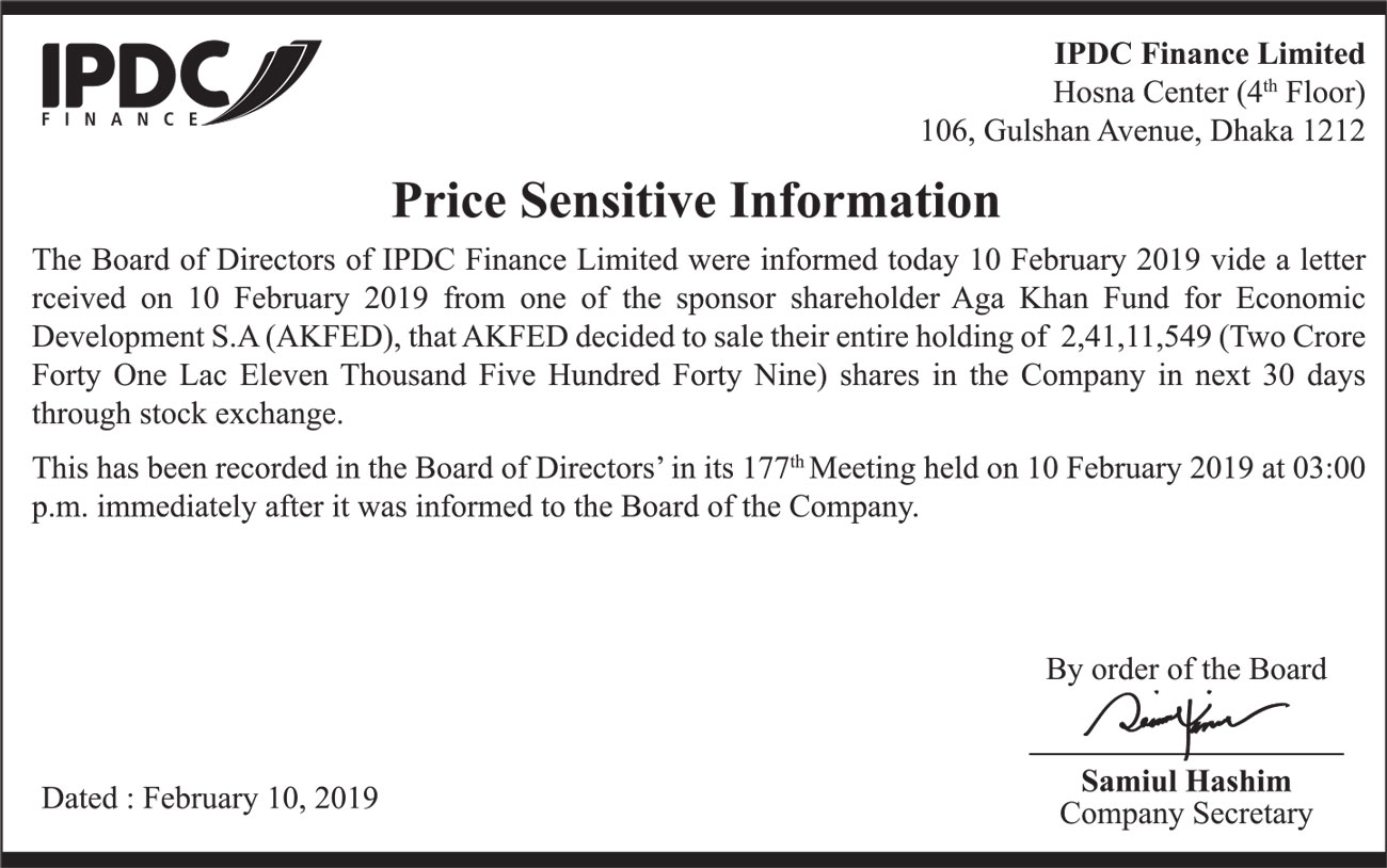 Price Sensitive Information (Sponsor Share Sale) of IPDC Finance Limited