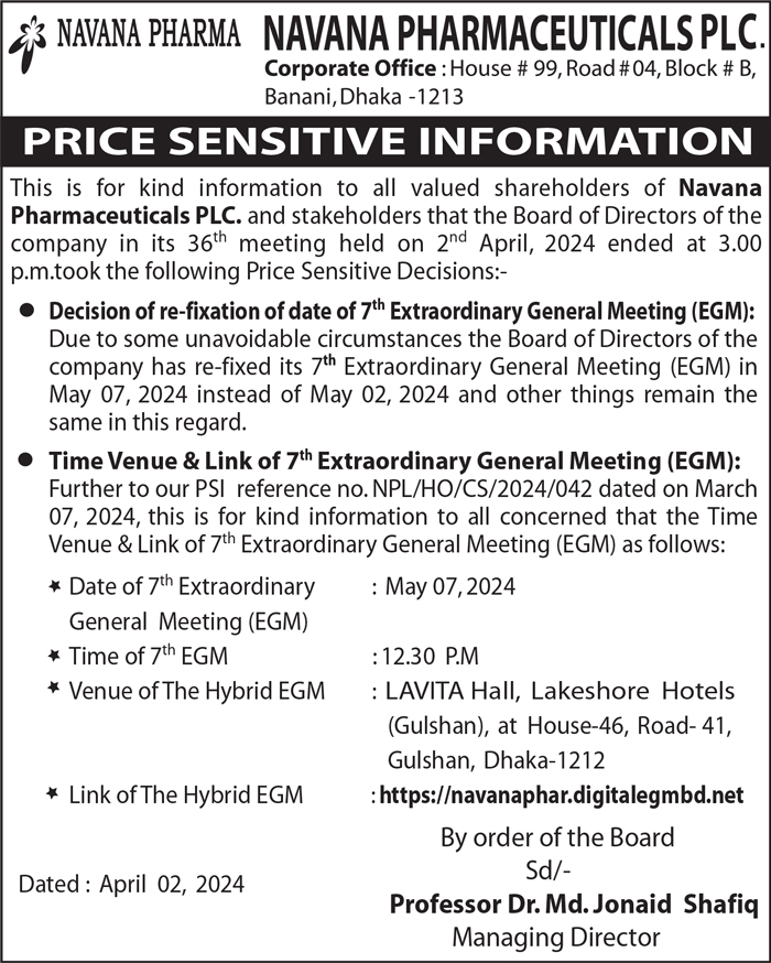 Price Sensitive Information of Navana Pharmaceuticals PLC.