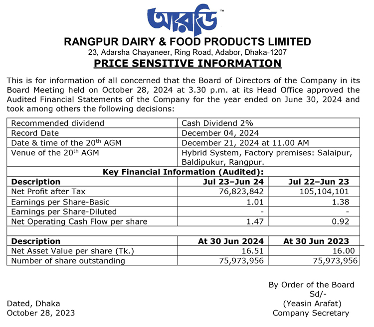 Price Sensitive Infortmation of Rangpur Dairy & Food Products Ltd.