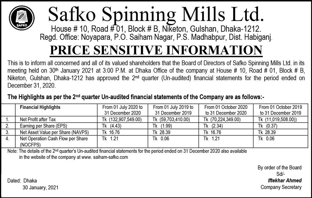 Price Sensitive Information of SAFKO Spinning Mills Ltd