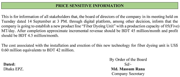 Price Sensitive Information of Queen South Textile Mills Ltd.