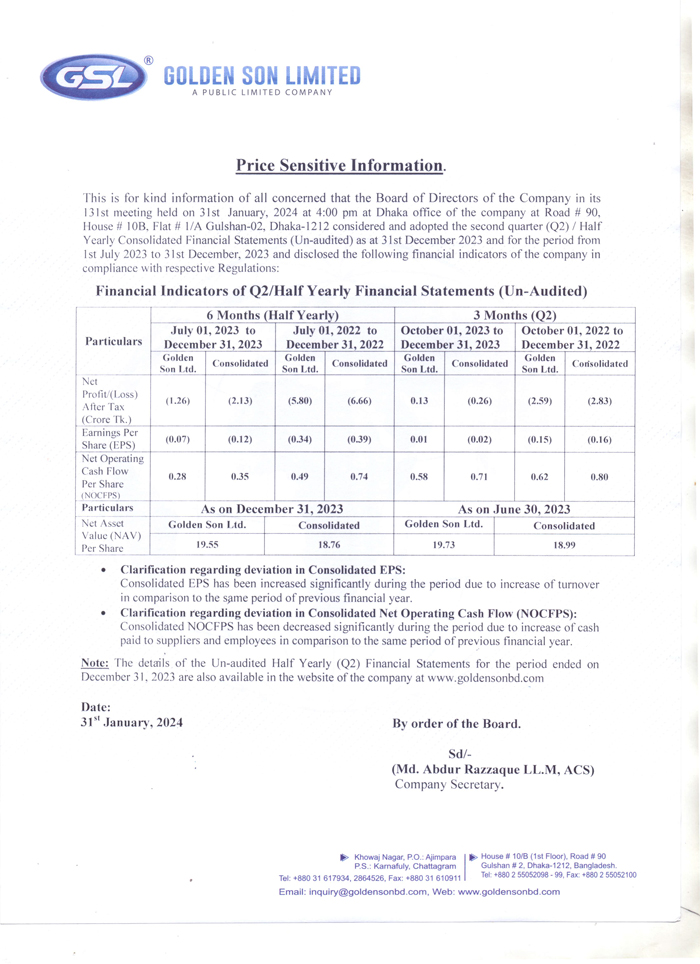Price Sensitive Information of Golden Son Ltd.