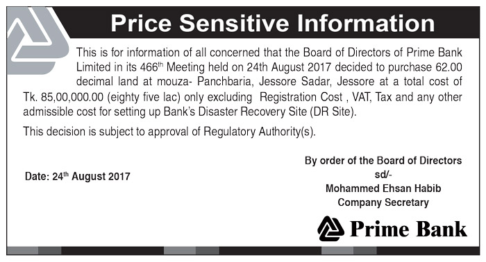 PRIME BANK LIMITED PRICE SENSITIVE INFORMATION