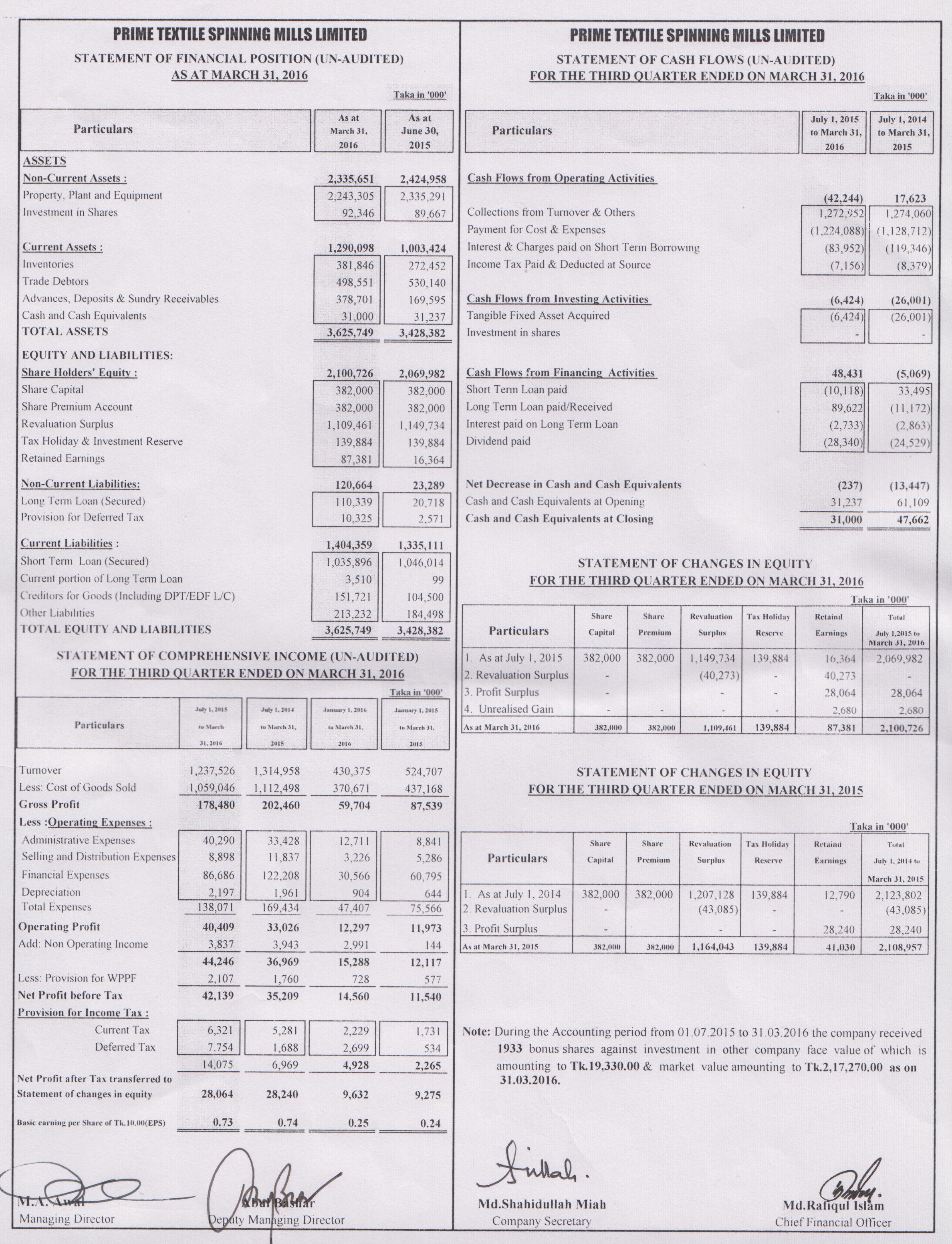 Un-audited Q1 Financial Statements of Prime Textile Spinning Mills Limited