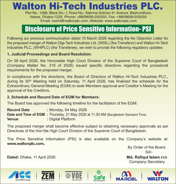 PSI regarding Extraordinary General Meeting (EGM) for Merger of Walton Digi-Tech Industries Ltd. (Transferor) with Walton Hi-Tech Industries PLC. (Transferee)