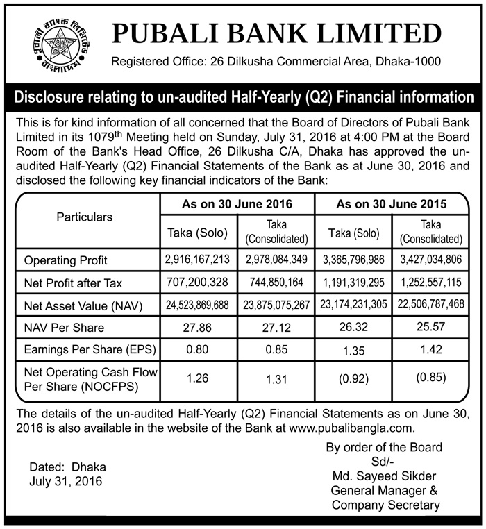 PUBALI BANK LTD HALF-YEARLY FINANCIAL STATEMENTS