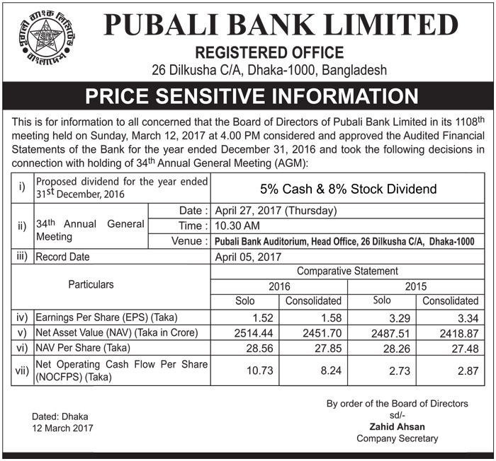 PUBALI BANK LTD PRICE SENSITIVE INFORMATION MARCH 2017