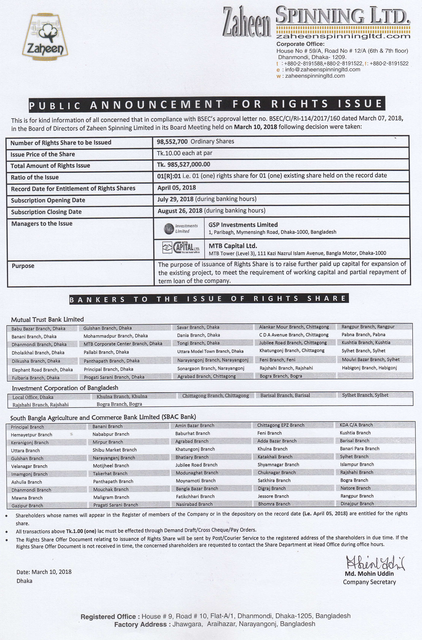 Public Announcement for Right Issue of Zaheen Spinning Ltd.