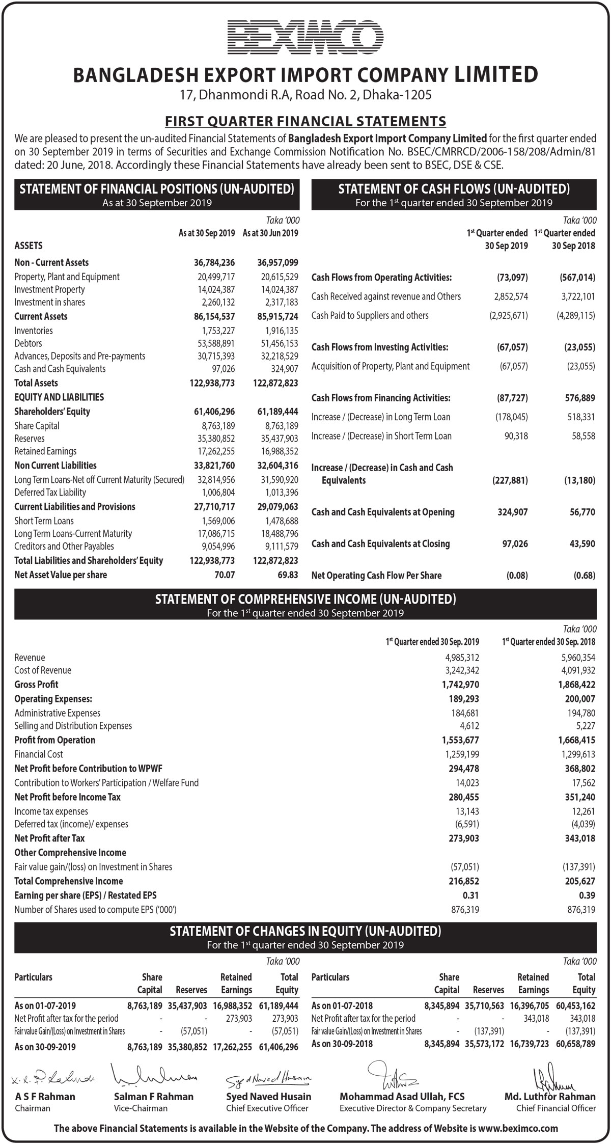 Q1 Financial Statements of Bangladesh Export Import Company Limited (BEXIMCO)