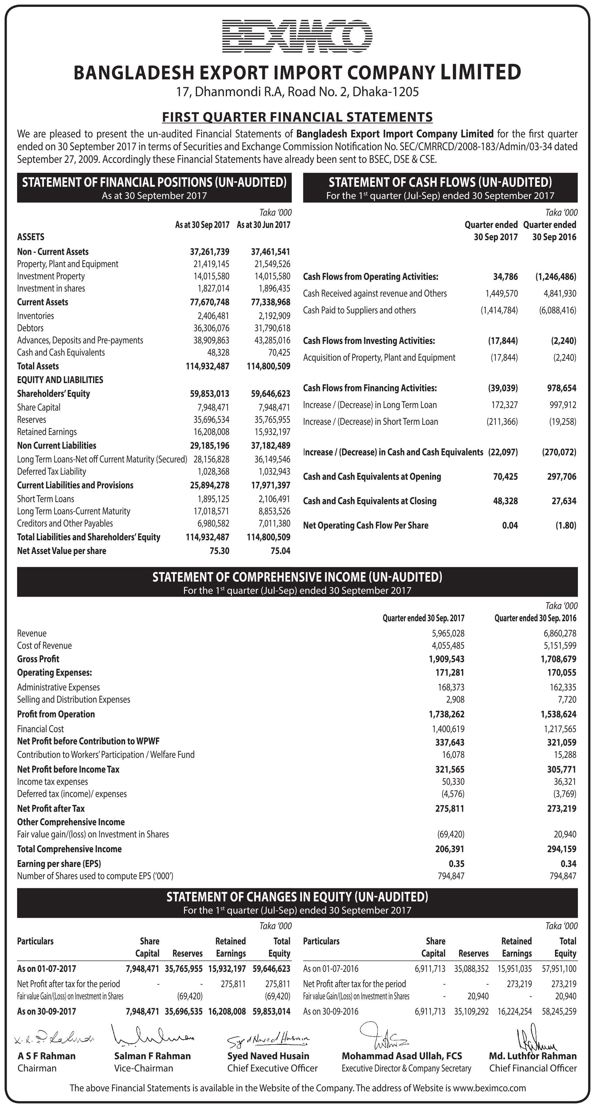 Q1 Financial Statements of Bangladesh Export Import Company Limited (BEXIMCO)