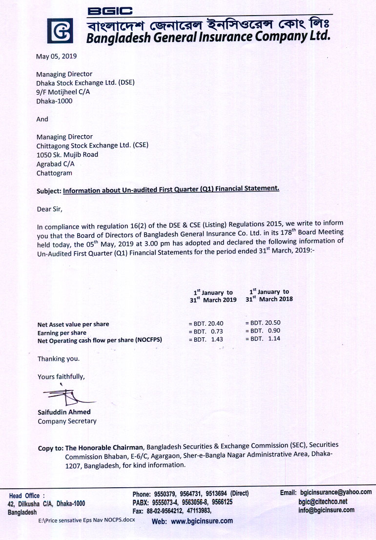 Q1 Financial Statements of Bangladesh General Insurance Company Ltd
