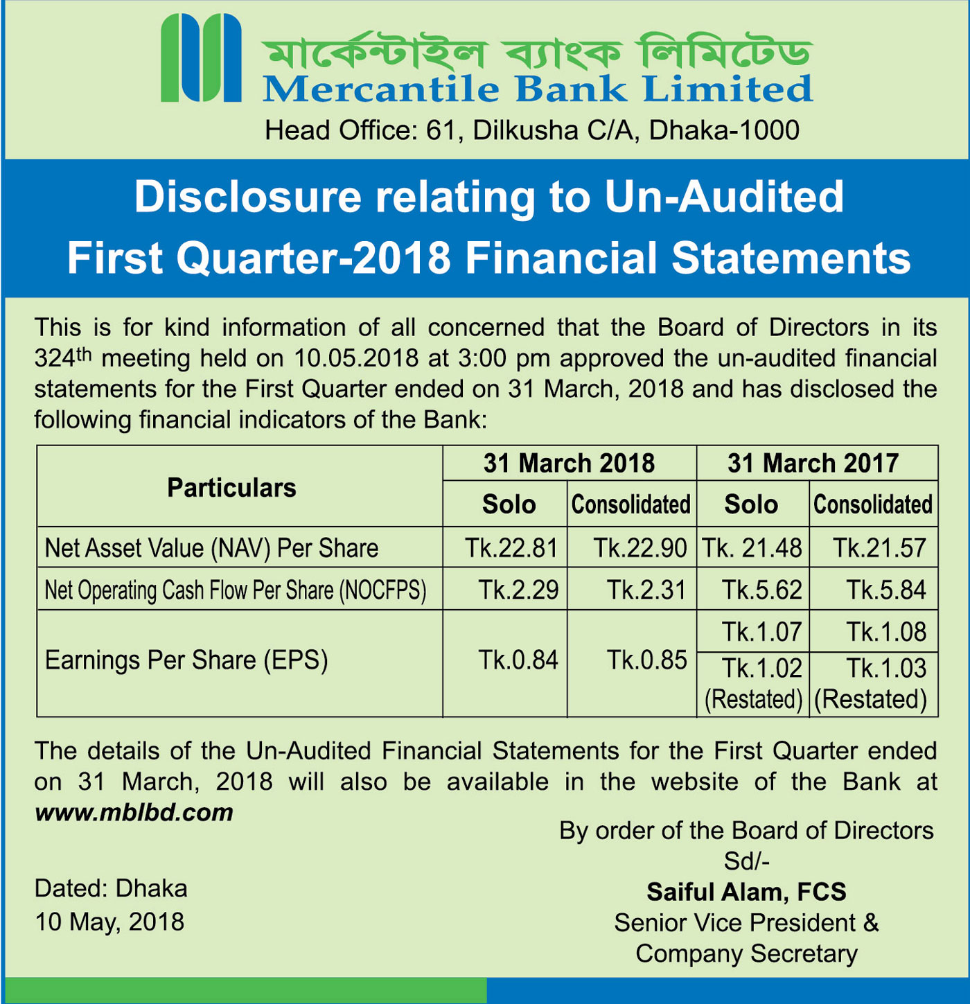 Q1 Financial Statements of Mercantile Bank Limited
