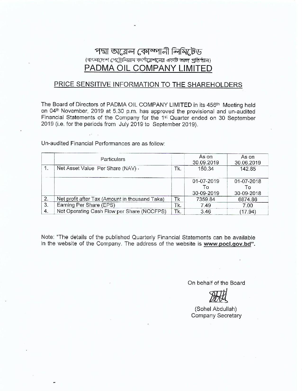 Q1 Financial Statements of Padma Oil Company Ltd.