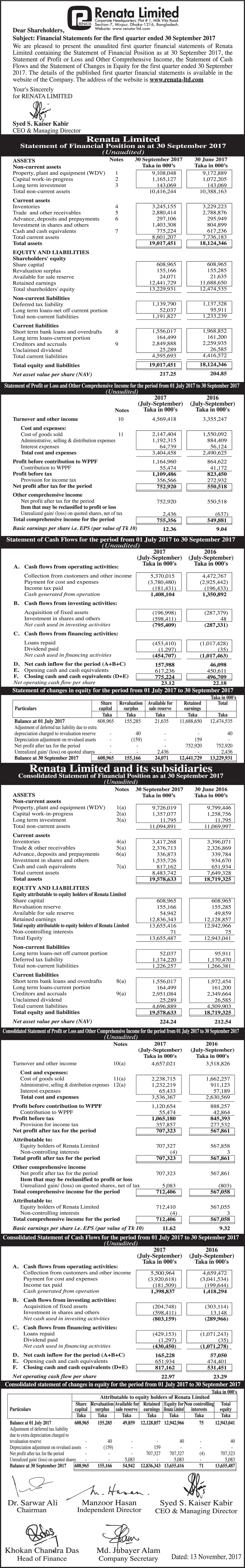 Half Yearly (Q2) Financial Statements (Unaudited) of Renata Limited