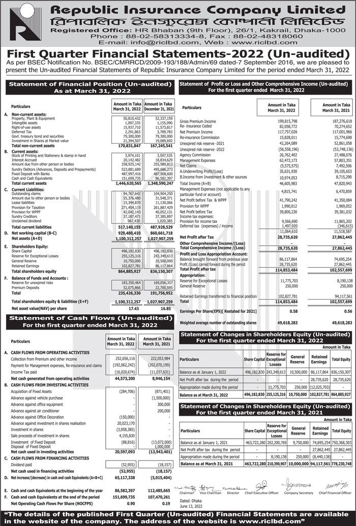 Q2 Financial Statements (Un-audited) of Republic Insurance Company Limited