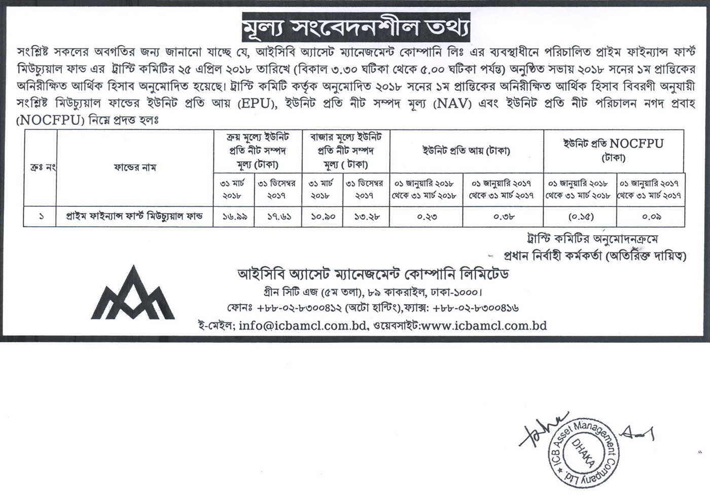 Price Sensitive Information of Prime Finance First Mutual Fund