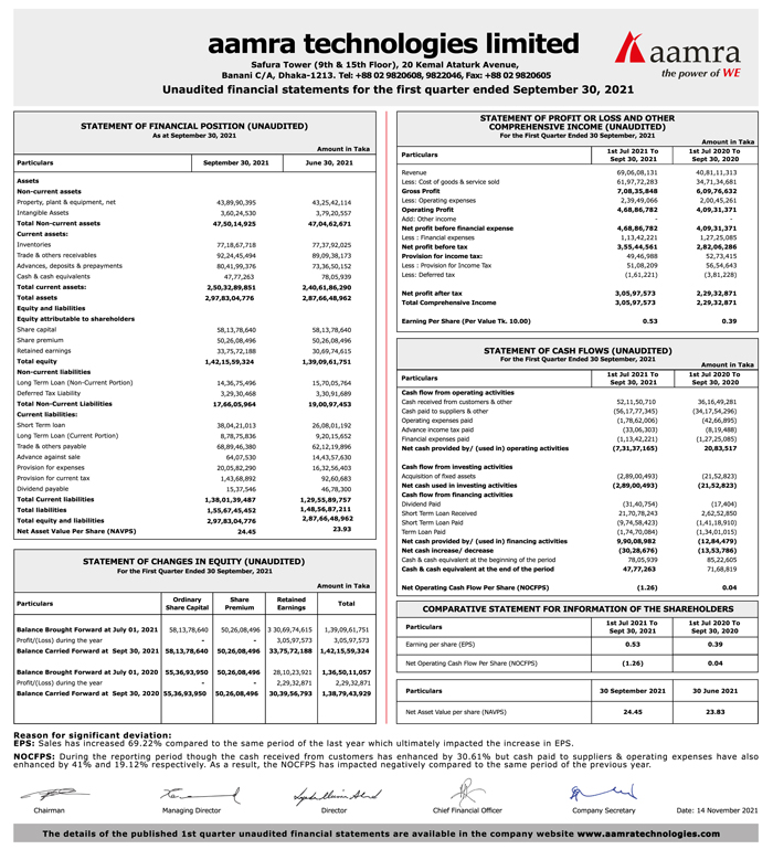 Un-audited Q2 Financial Statements of Aamra technologies limited