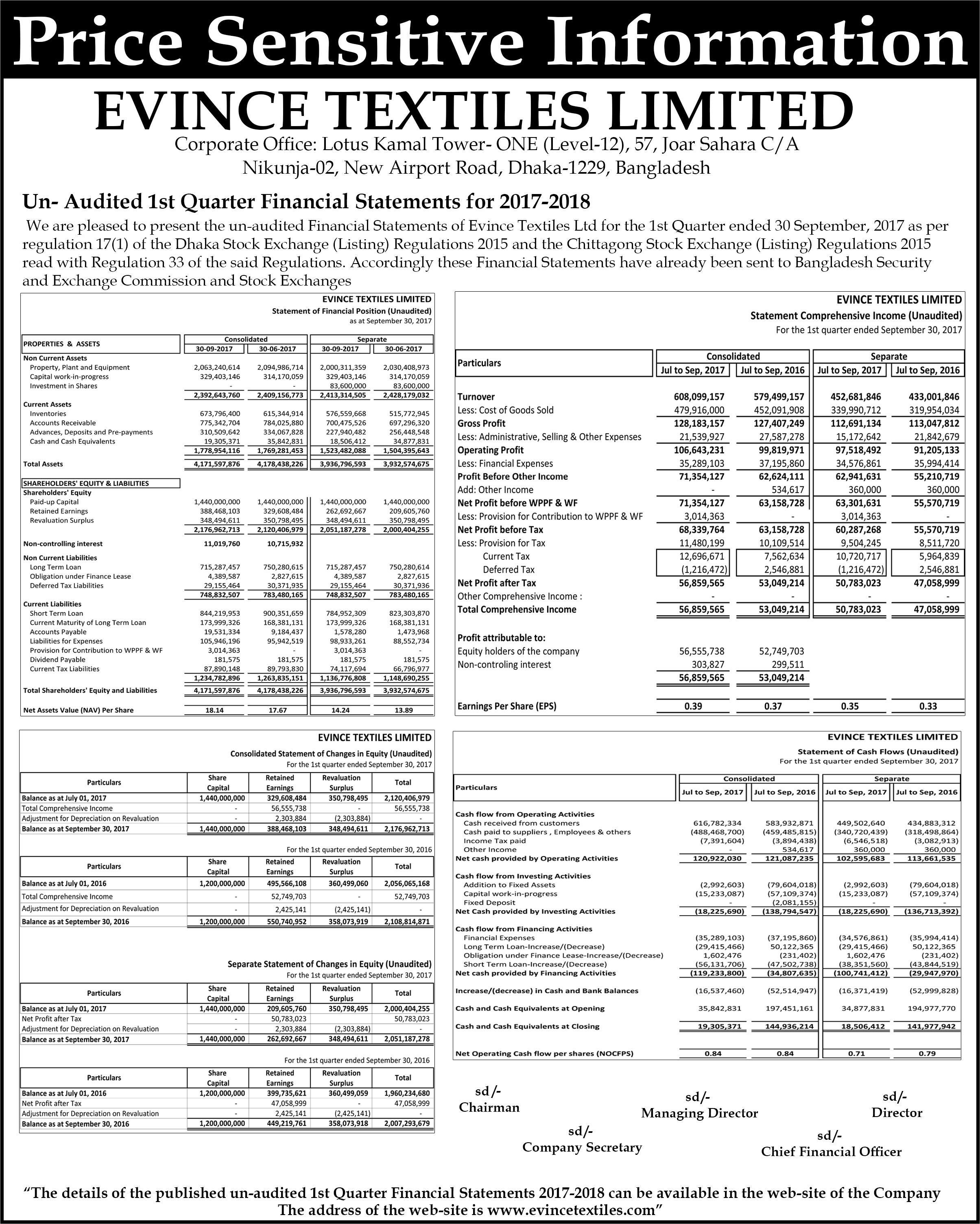 Q1 Financial Statements (Un-audited) of Evince Textile Ltd.