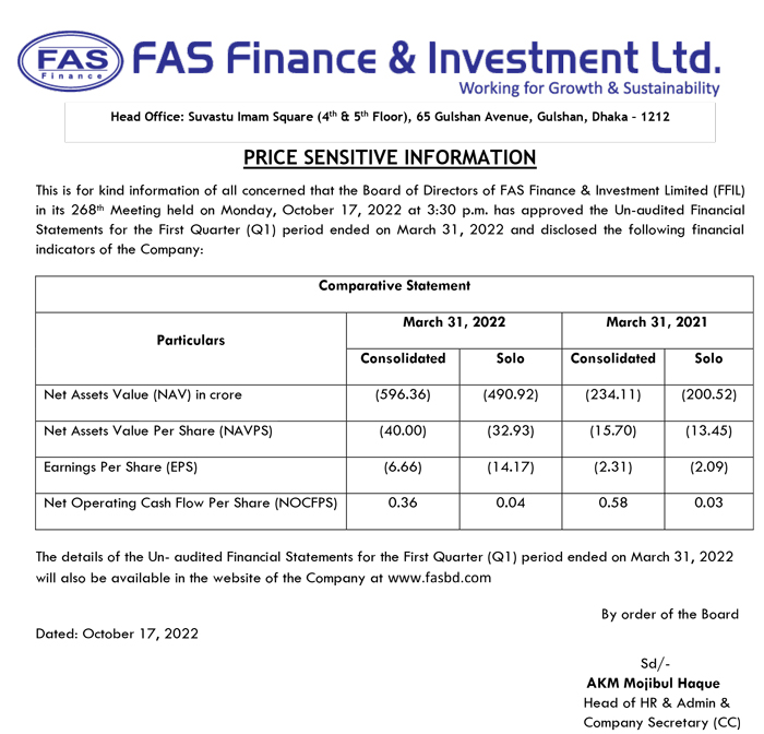 Q1 Financial Statements (Un-audited) of FAS Finance & Investment Limited