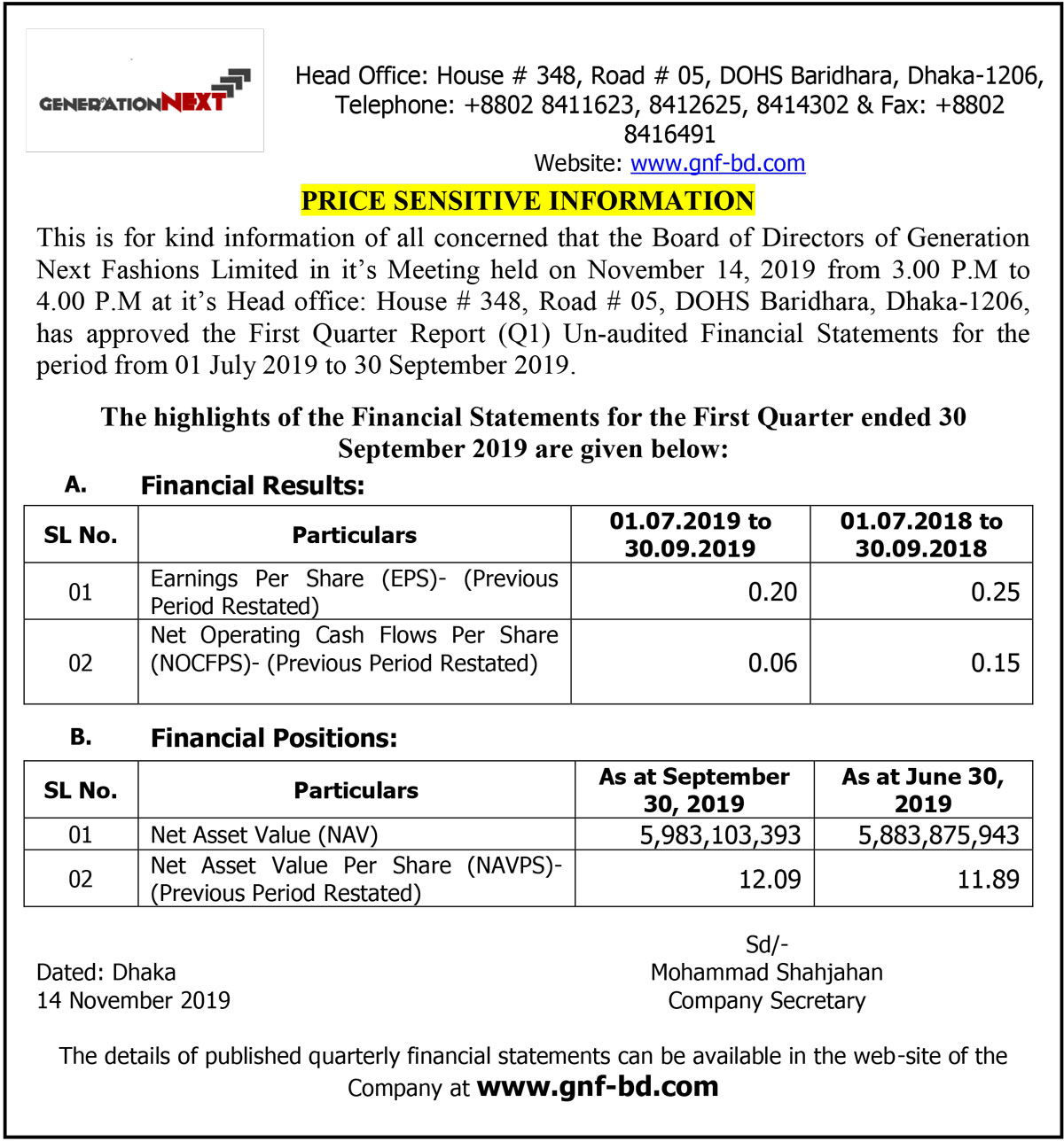 Q1 Financial Statements (Un-audited) of Generation Next Fashions Limited