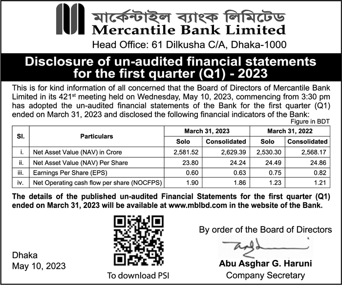 Q1 Financial Statements (Un-audited) of Mercantile Bank Limited