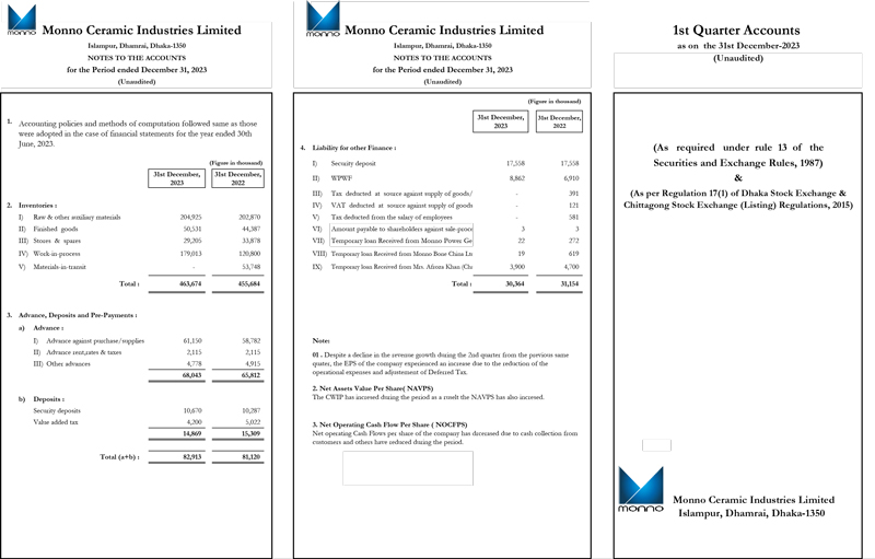 Q1 Financial Statements (Un-audited) of Monno Ceramic Industries Ltd.