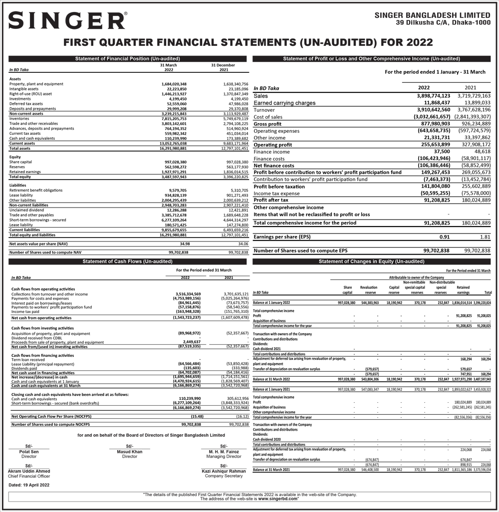 Un-audited Q1 Financial Statements of Singer Bangladesh Limited