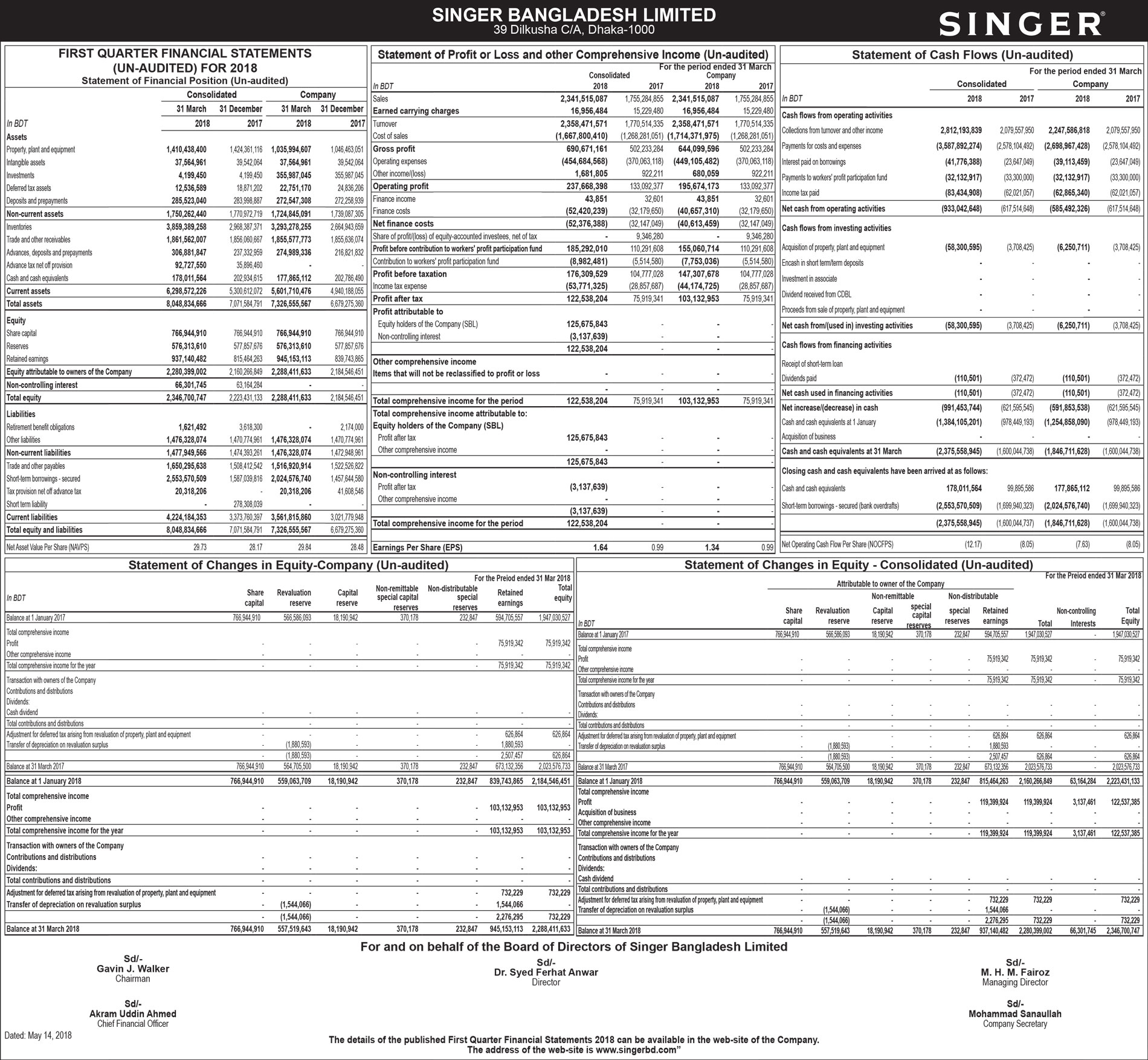 Q1 Un-audited Financial Statements of Singer Bangladesh Limited