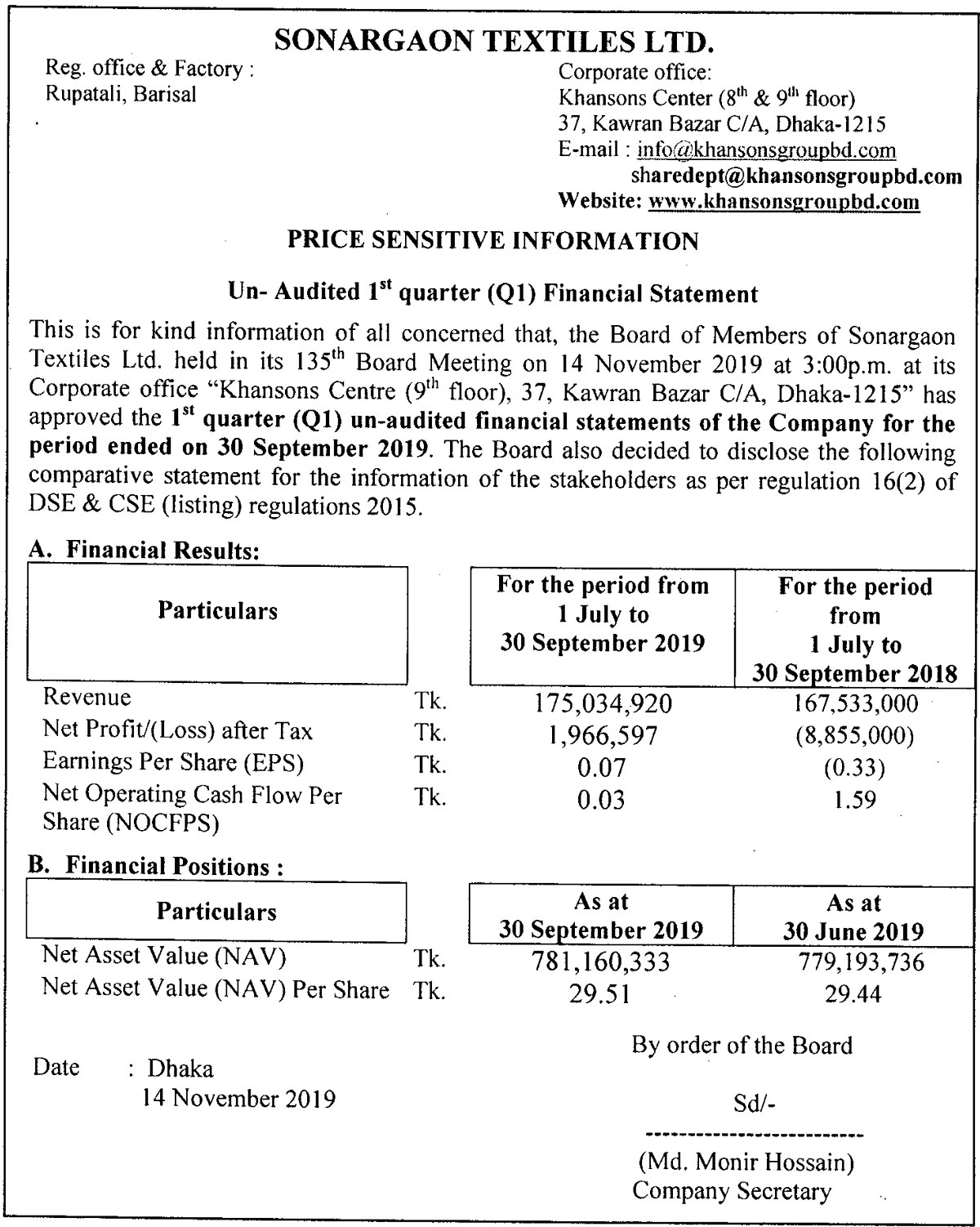 Price Sensitive Information of Sonargaon Textiles Ltd.