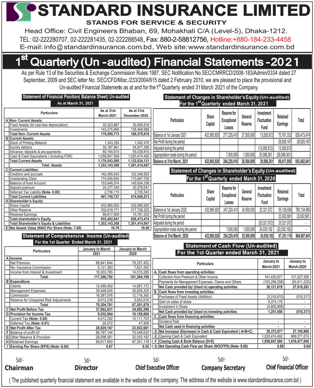 Q1 Financial Statements (Un-audited) of Standard Insurance Limited