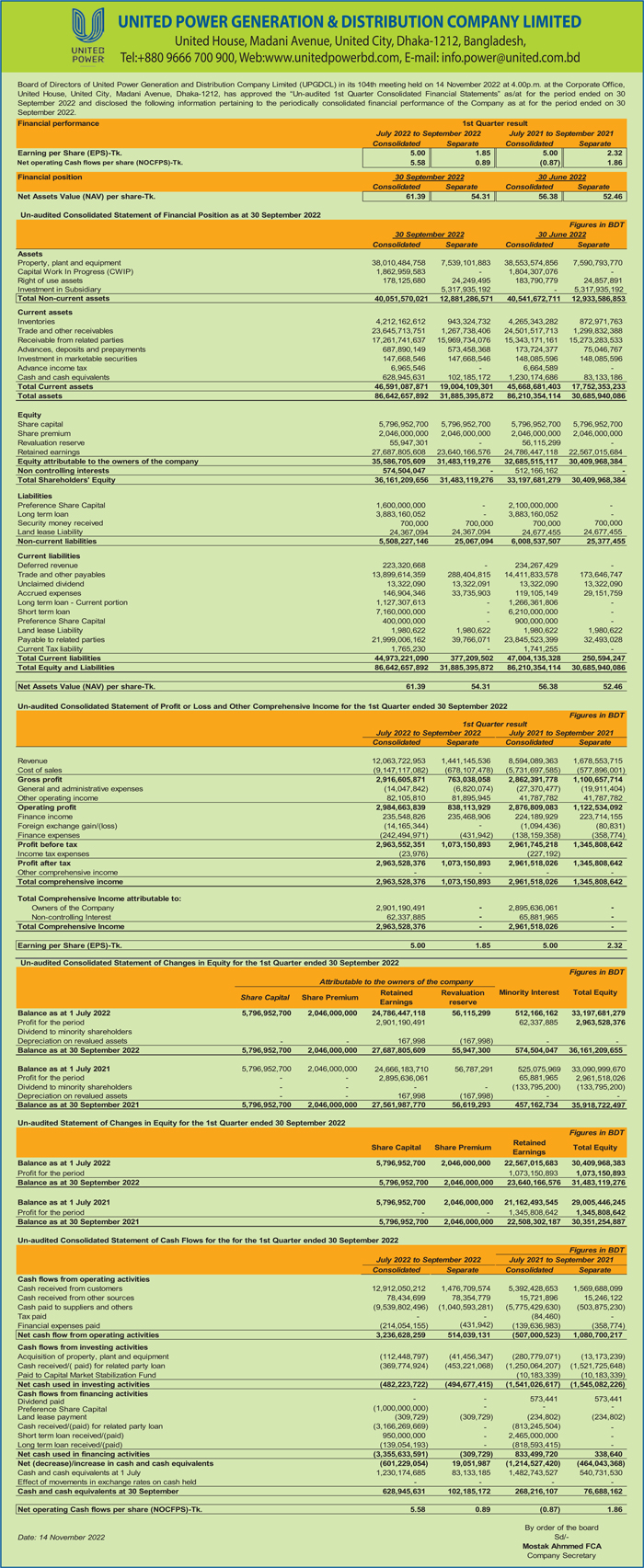 Q1 Financial Statements (Un-audited) of United Power Generation & Distribution Company Ltd