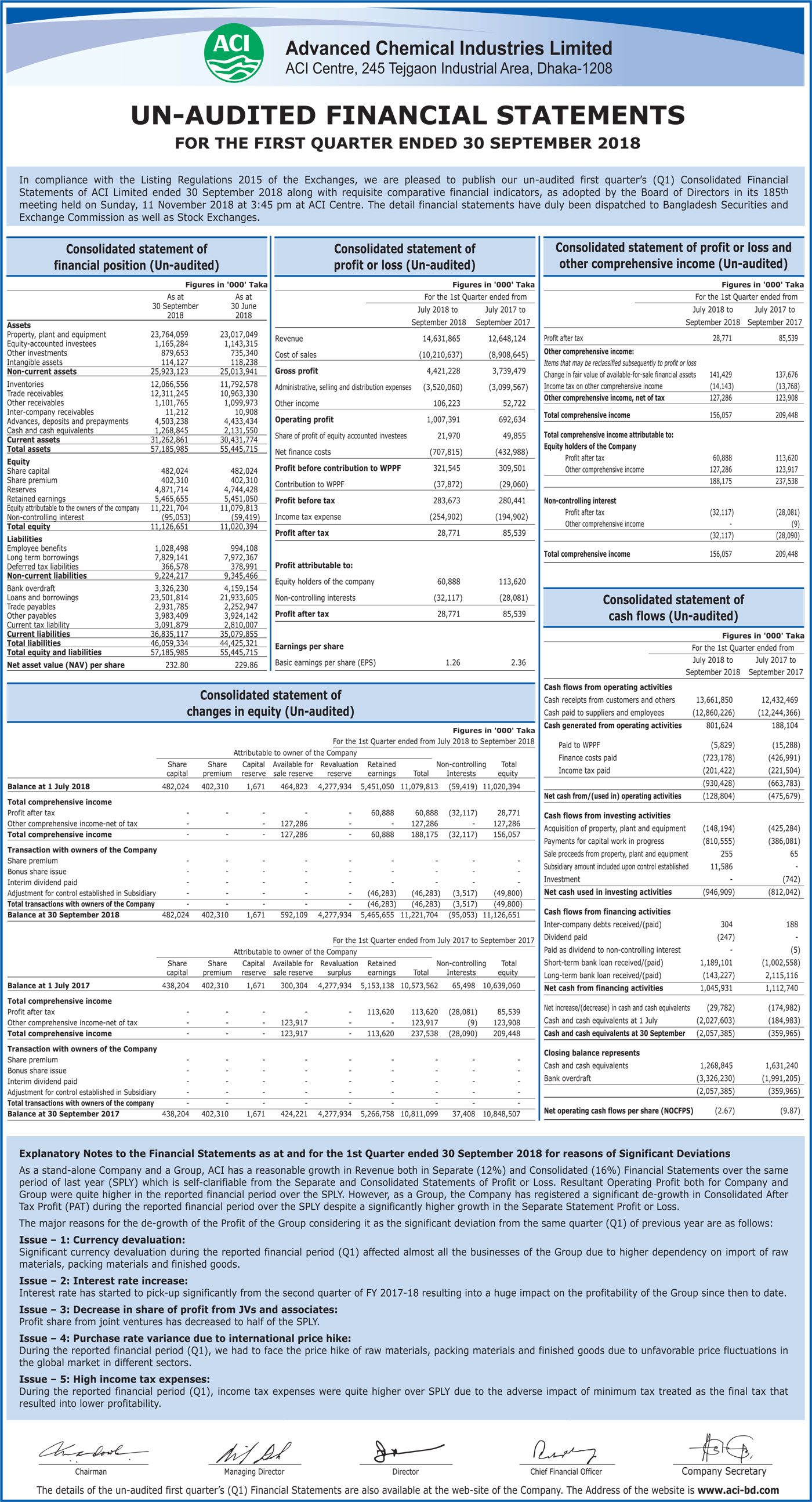 Q3 Un-audited Financial Statements of Advanced Chemical Industries PLC (ACI)