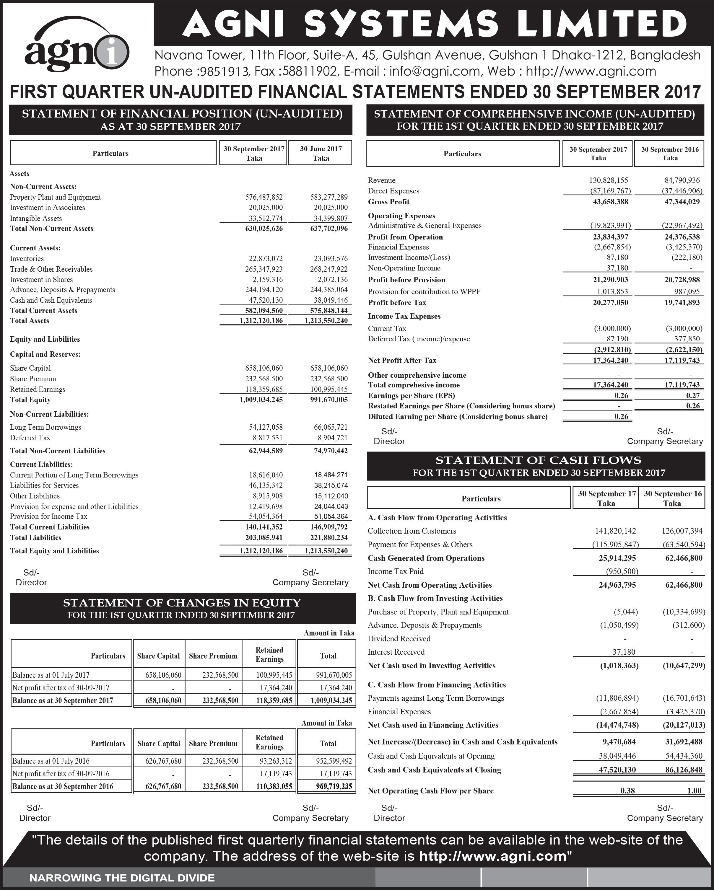 1st Quarter Un-Audited Financial Statements Of Agni Systems Ltd